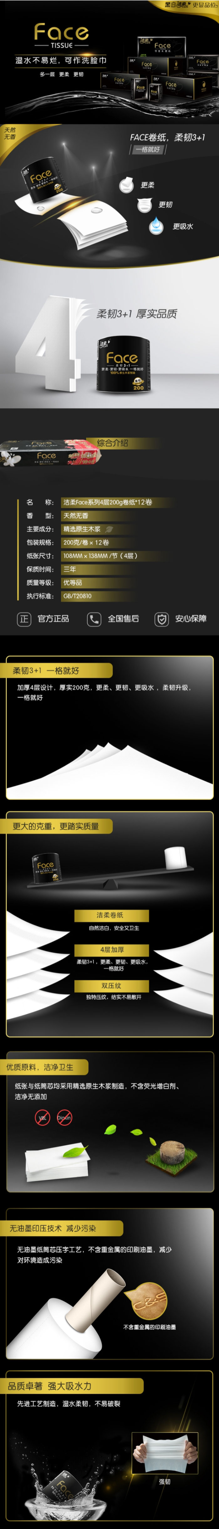 品名:洁柔 卷纸 BJ173-12N 200g*12卷装 2400g face 有芯 4层