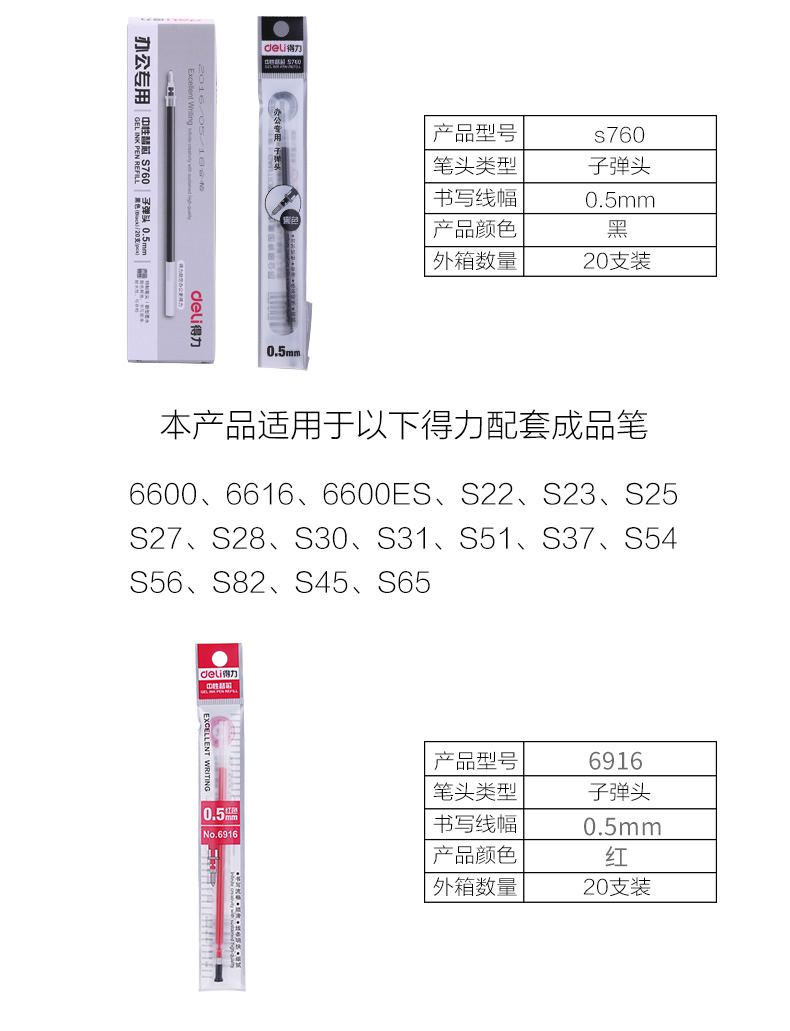 品名:得力(deli) 中性笔芯0.5 S760 0.5mm 红色 20支/盒