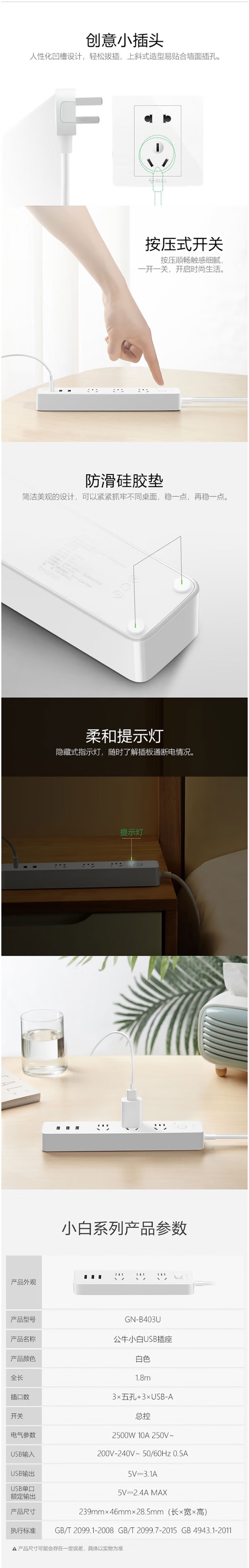 品名:公牛 公牛小白USB插座 公牛小白USB插座 GN-B403U 3usb接口+3孔全长1.8米带...