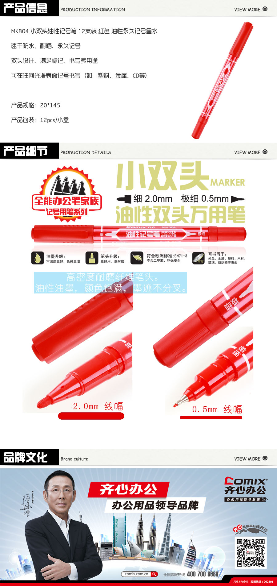 品名:齐心(Comix) 小双头记号笔 MK-804 速干防水 0.5mm 12支装 红色