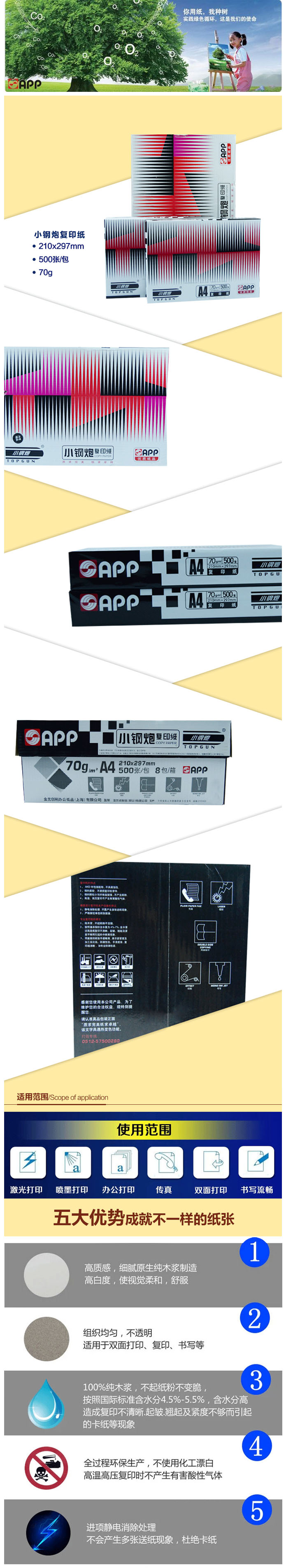 适宜双面使用,降低办公综合使用成本 ,优质裁切工艺,纸张不静电 ,运转顺畅,不卡纸
