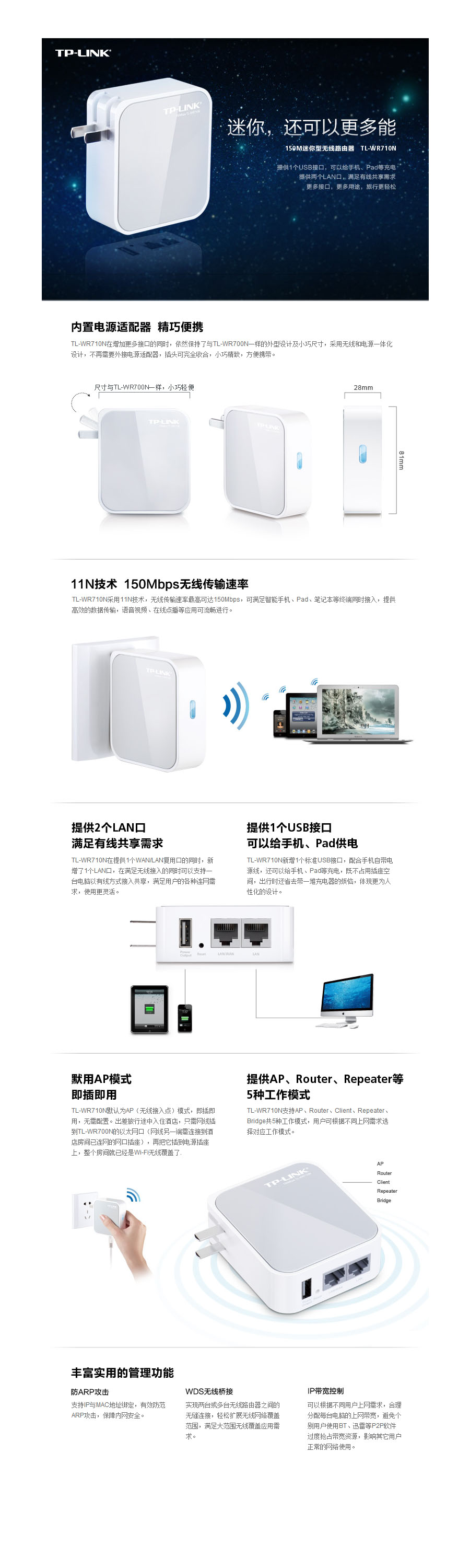品名:TP-LINK 迷你型无线路由器 TL-WR710N 150M 81mm x 71mm x 28mm(L x W x H)