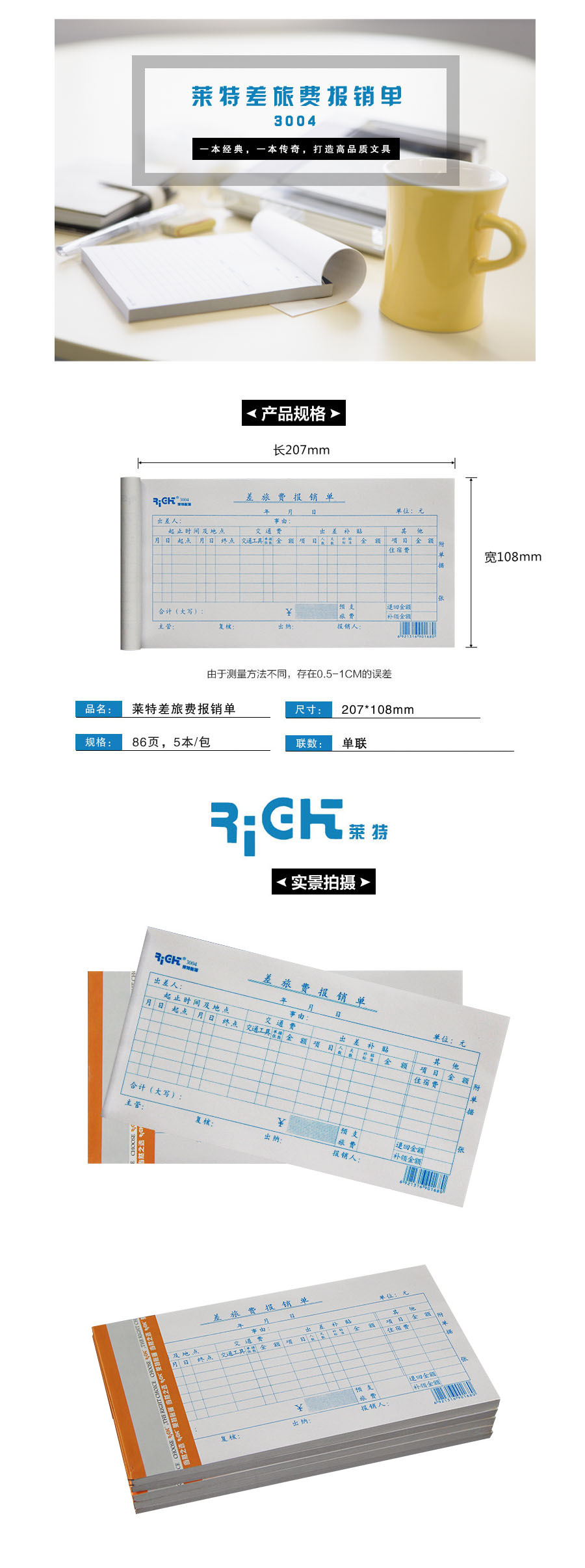 品名:莱特 差旅费报销单 3004 107×207mm 100页