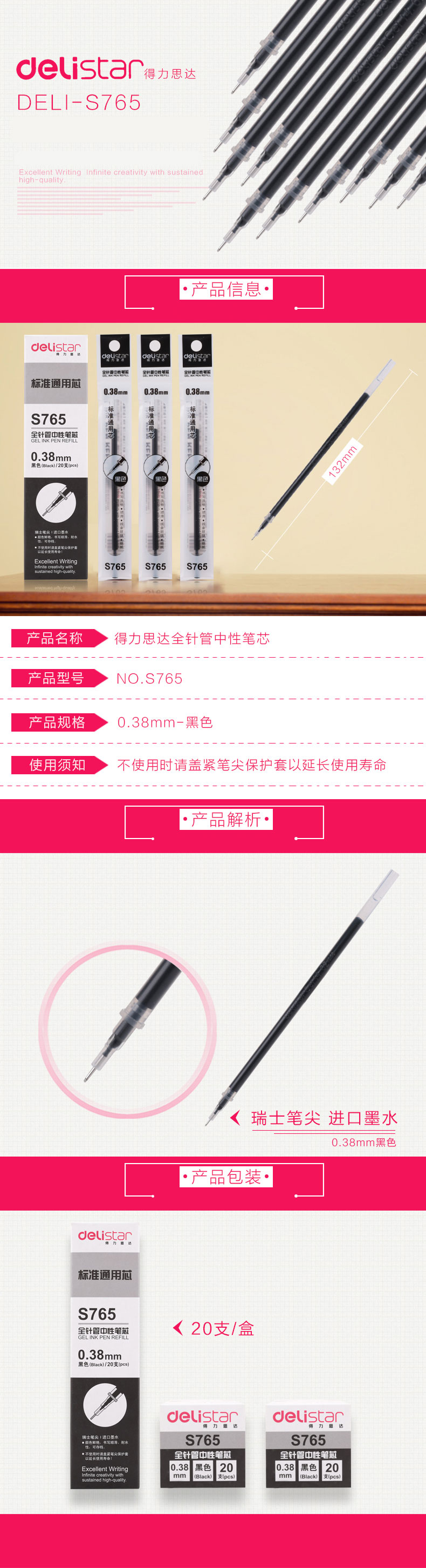品名:得力(deli) 笔芯 S765 全针管 0.38mm 黑