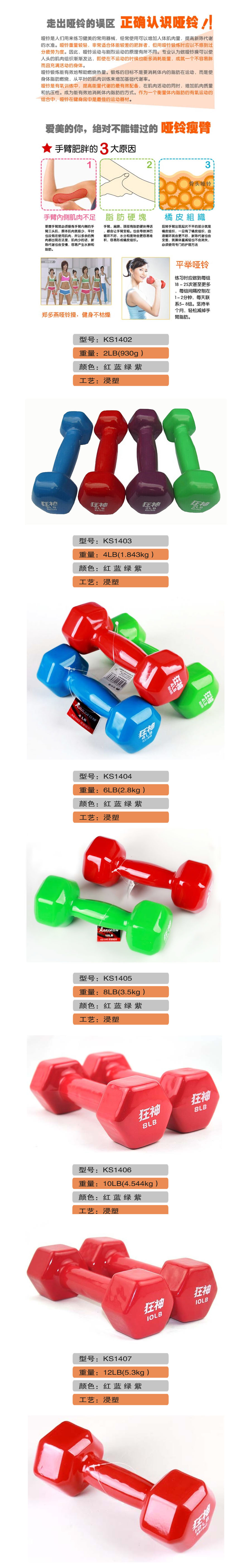 品名:狂神 彩色光面浸塑哑铃 1046 10磅(10LB)颜色随机